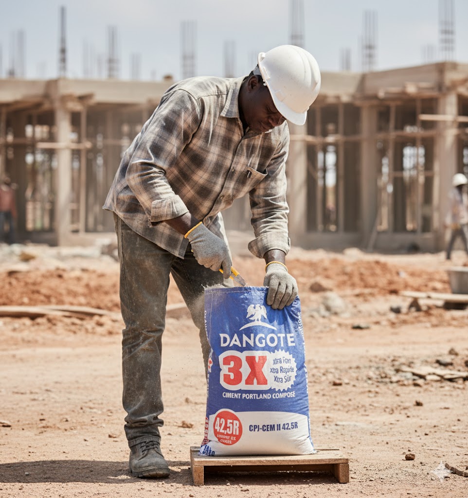 Produit : Ciment Dangote 42.5R (souvent commercialisé sous la gamme 3X, signifiant "Extra résistant, Extra durable, Extra performant")